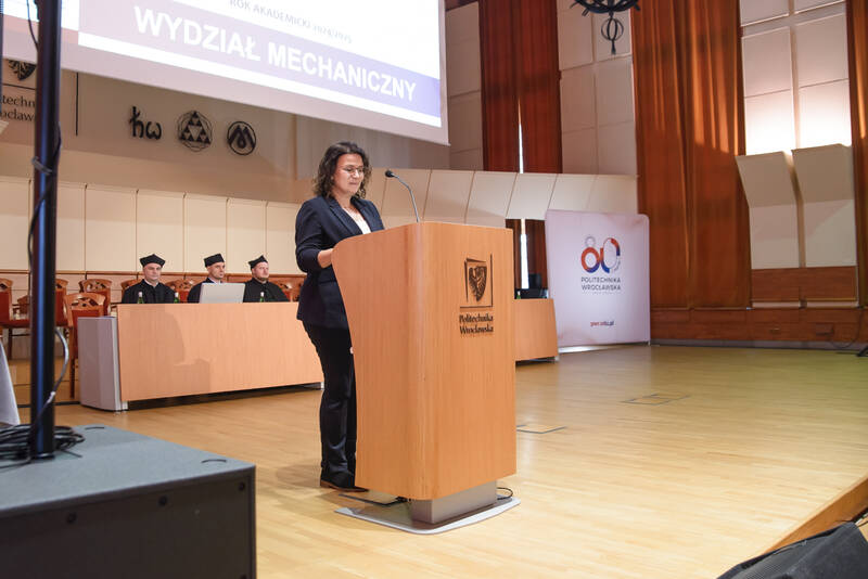 Uroczystość otworzyła Dziekan Wydziału Mechanicznego, prof. dr hab. inż. Celina Pezowicz, która w swoim wystąpieniu podkreśliła znaczenie rzetelnej wiedzy inżynierskiej, pasji i odpowiedzialności w kształtowaniu przyszłości inżynierii mechanicznej. Zwracając się do absolwentów, pogratulowała im wytrwałości w dążeniu do celu oraz życzyła, aby zdobyte umiejętności i doświadczenie stały się solidnym fundamentem ich dalszej kariery zawodowej i osobistego rozwoju.